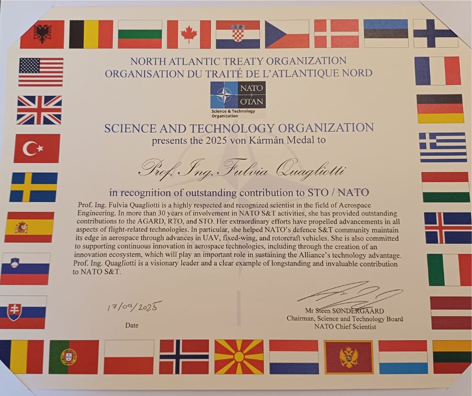 La consegna della medaglia Medaglia Von Kármán è avvenuta a Valencia nel Quarter General Terrestre de Alta Disponibilidad al cospetto del governance board of the NATO Science & Technology come riconoscimento per la sua lunga e preziosa collaborazione, avendo lavorato a stretto contatto con lo STO e le sue organizzazioni precedenti. Da quando è entrata a far parte dell’AGARD Flight Mechanics Panel nel 1992, l’ingegnere Fulvia Quagliotti ha ricoperto diversi ruoli dirigenziali all’interno dello STO, tra cui: rappresentante del mondo accademico italiano nei Comitati Scientifici e Tecnici (STC) per la Tecnologia Applicata dei Veicoli (AVT) e per i Concetti e l’Integrazione dei Sistemi (SCI); Vicepresidente del Comitato Scientifico e Tecnico (STC) dello SCI; Presidente del Comitato di Programma dello SCI; membro del Comitato Strategico dell’AVT e Mentore del Panel AVT, oltre ad altre funzioni.